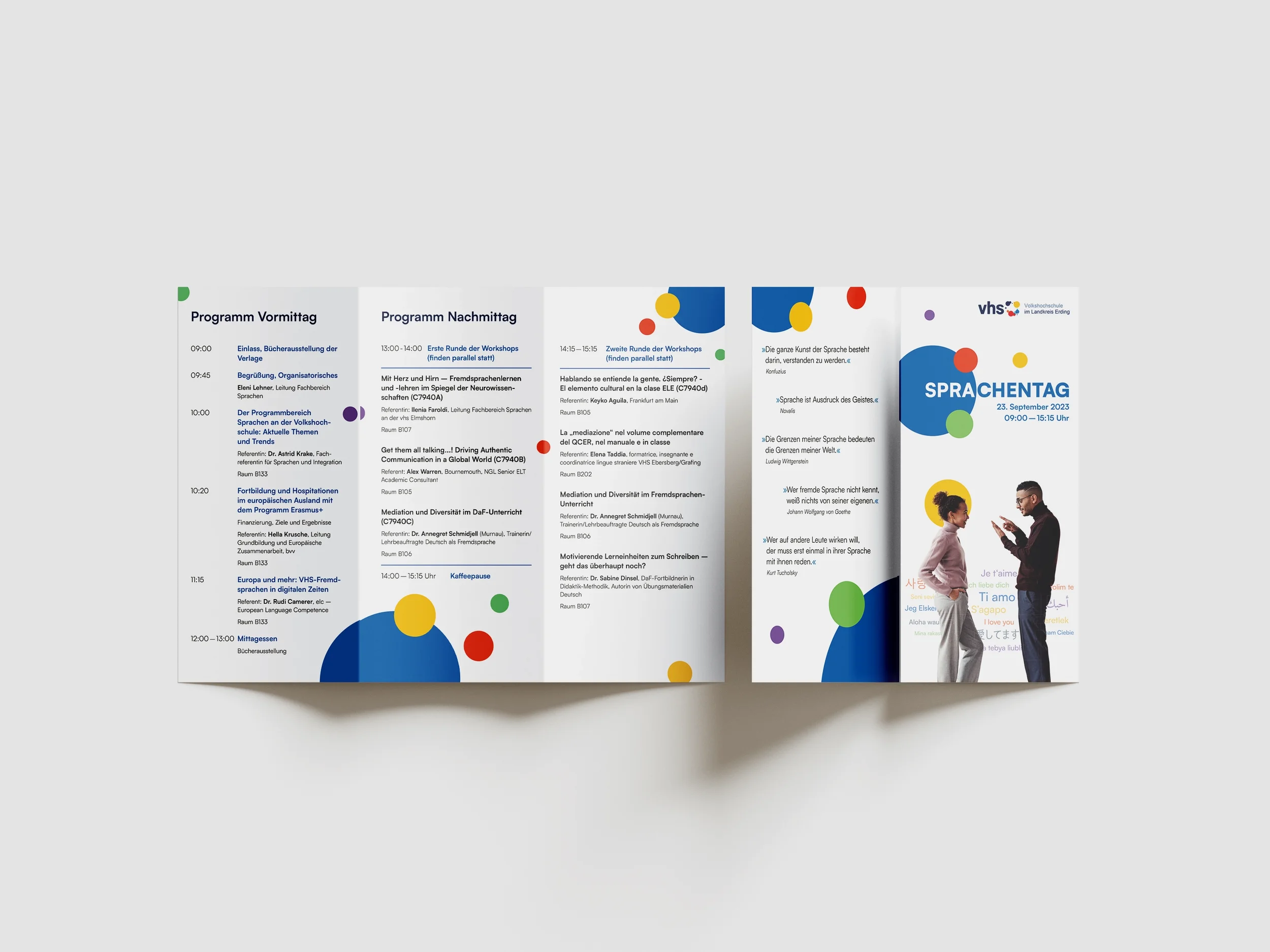 Zur Bewerbung dieser Veranstaltung habe ich ein aussagekräftiges Plakat sowie einen Flyer mit dem kompletten Tagesprogramm gestaltet. Dabei galt es, kreativ mit den bestehenden CI-Vorgaben der VHS zu arbeiten.